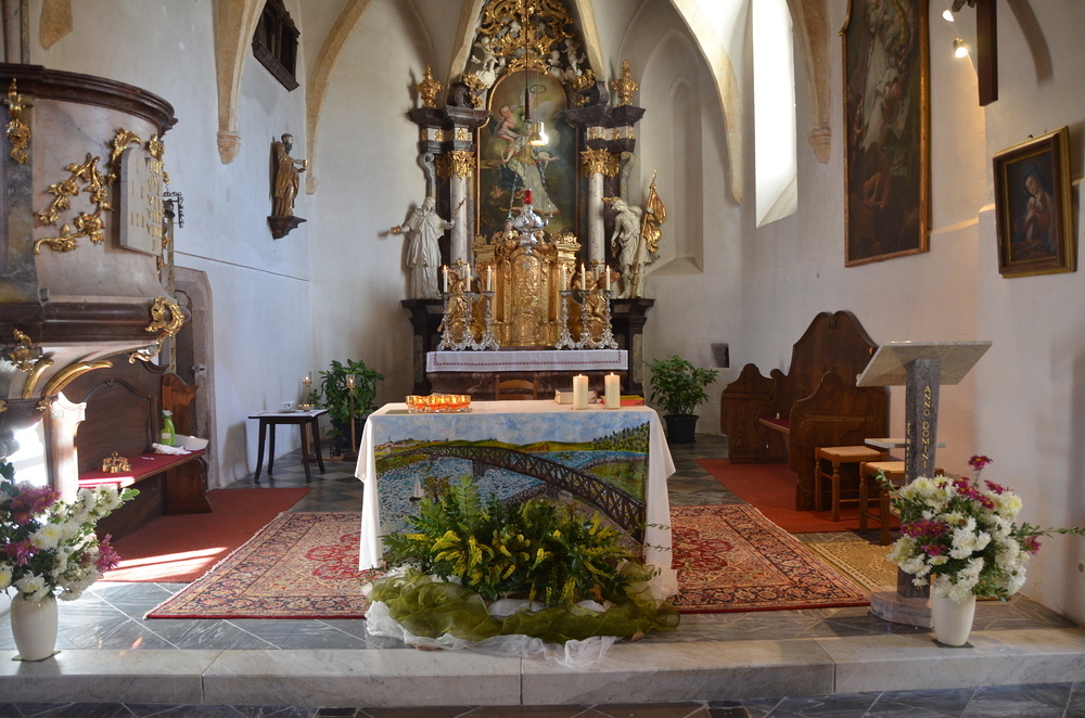 Bei der Allerheiligenlitanei wurden die Heiligen unserer Filialkirche angerufen, wobei die Ministranten auf ihr Bild dabei zeigten.