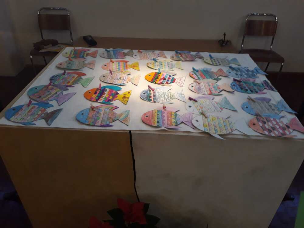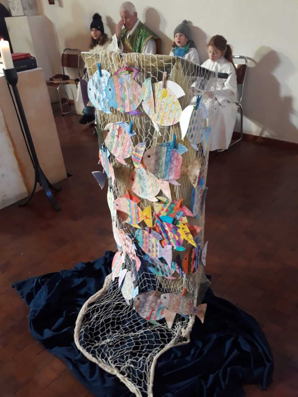 Am Freundschaftsnetz – das wir uns als Auffangnetz Gottes vorstellen können, wozu Prof. Schlacher anregte – konnten die Kinder ihre gestalteten Papierfische ankluppen.