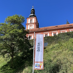 Mit einem Gedankenimpuls laden die Fahnen die Besuchenden zu einem vielfältigen Erleben von MARIATROST ein.