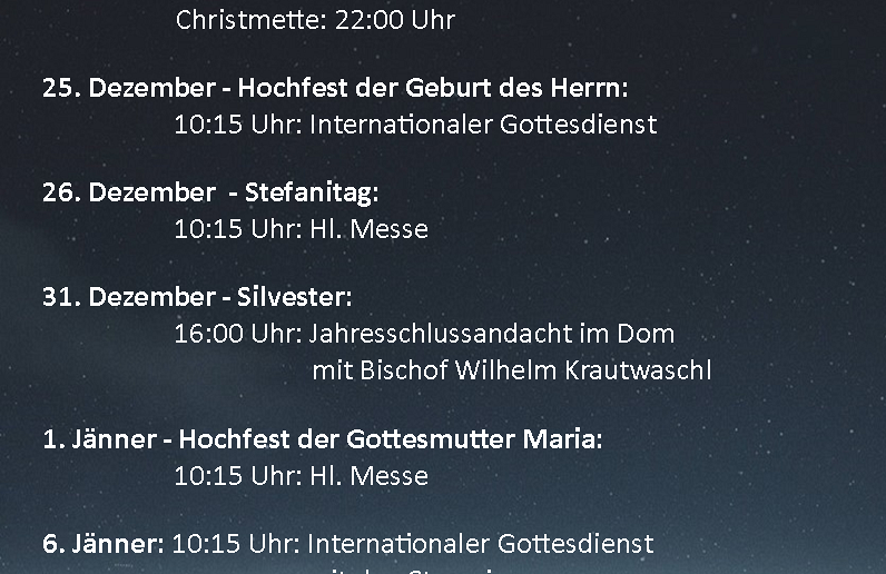 25. Dezember— Hochfest der Geburt des Herrn: 10:15 Uhr Hl. Messe; Internationaler Gottesdienst